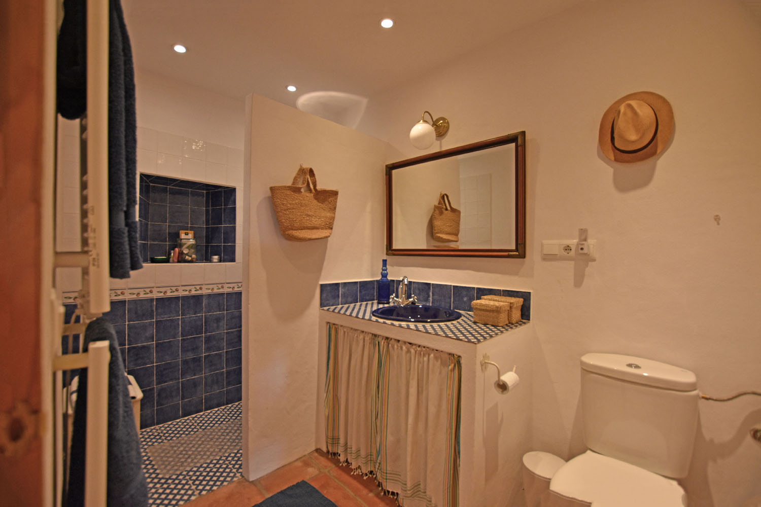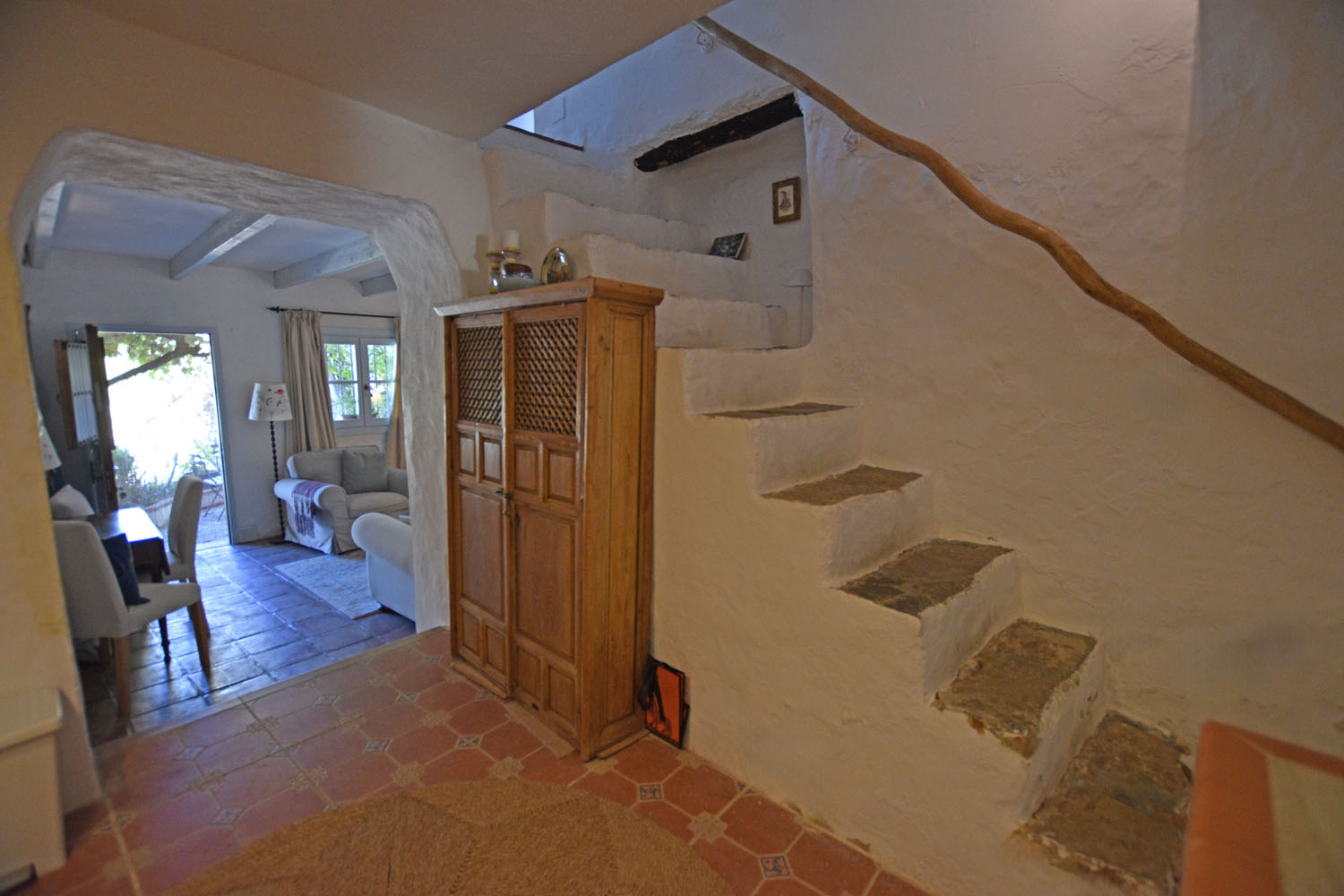 From the kitchen, an ancient stone staircase leads up to the Master bedroom, with built-in wardrobe space & terracotta floor tiles. This is a delightful, light & airy room with French doors opening to a balcony across the front of the cottage overlooking the patio. From here, there is a beautiful view of El Hacho mountain to the west (and the wonderful sunsets!). The adjacent shower room is well presented, bright & cheery with pretty Andalusian blue tiling and a walk-in shower.