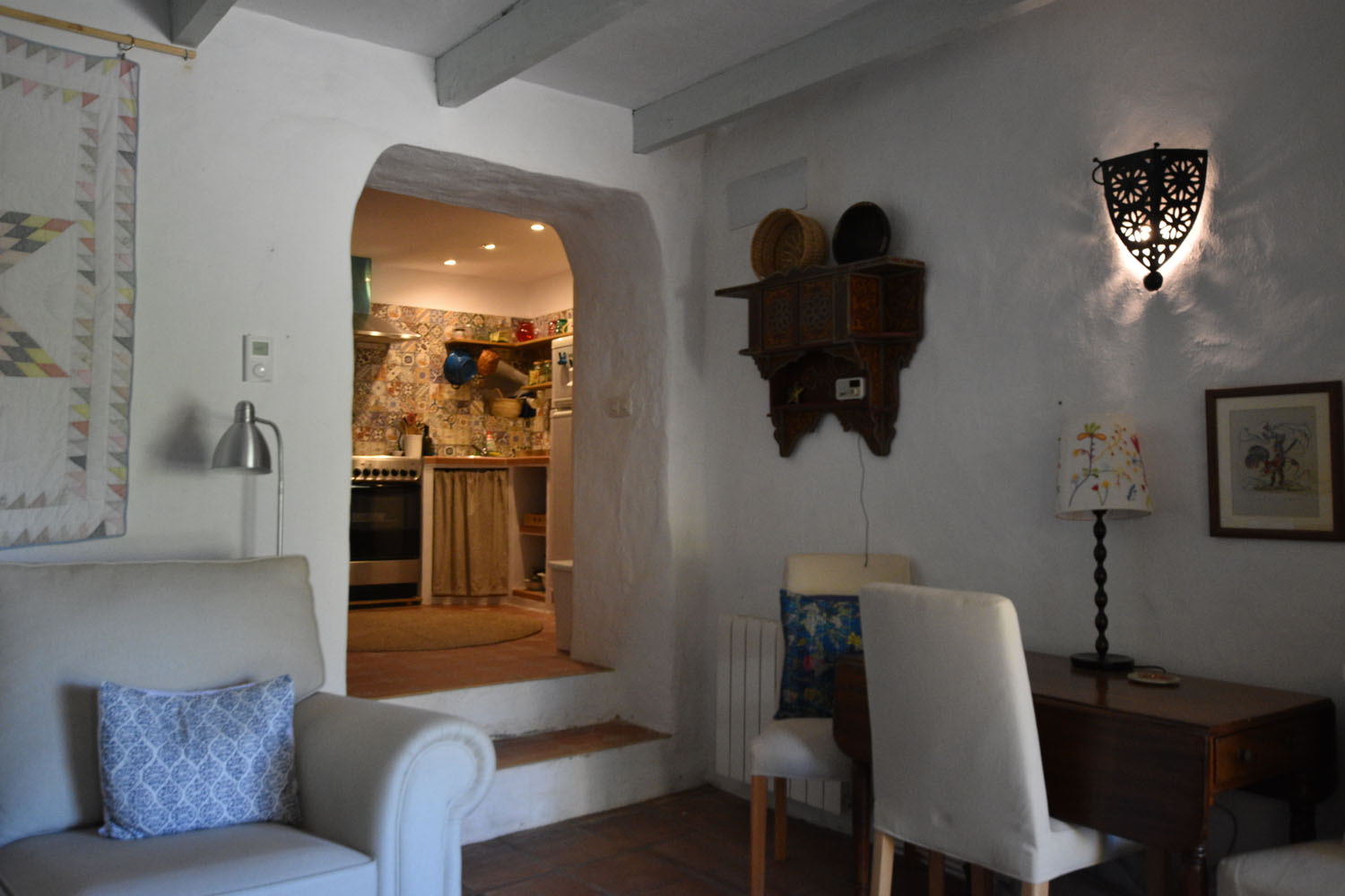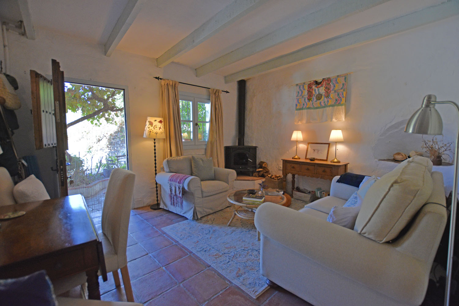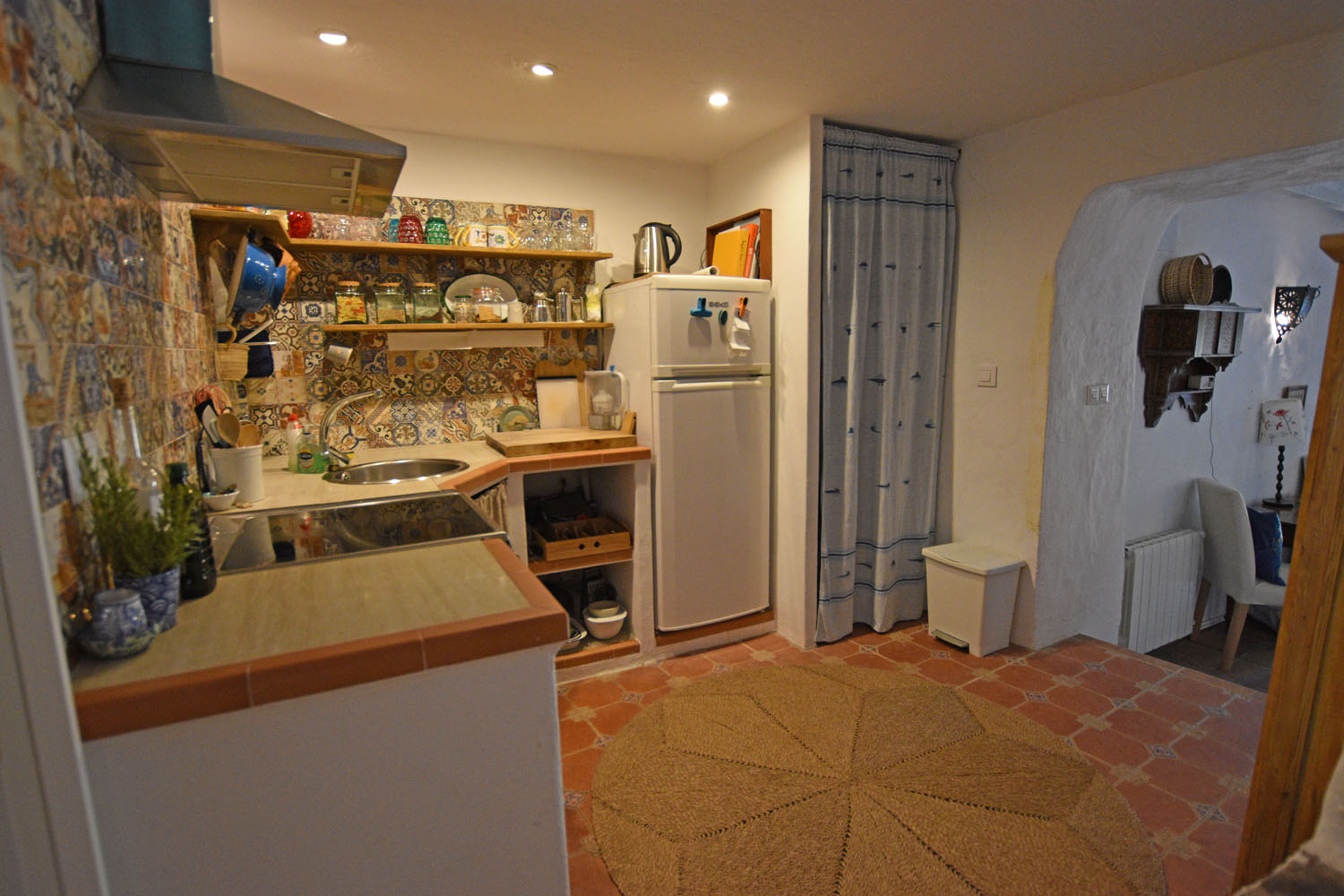 At the entrance to the cottage is a quaint little patio garden (with room for a small table), full of fragrant flowering shrubs & plants, including a Nispero tree, jasmine, oleander and a grapevine. The entrance door opens directly into the charming & comfortable open plan living space with a wood-burning stove, original terracotta tiled floor & oak-beamed ceiling. A Moorish archway leads into the pretty kitchen with colourful Andalusian wall tiles, and a useful storage area used as a pantry.