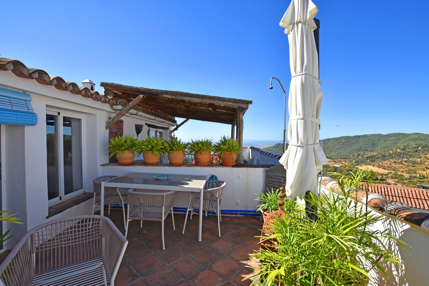 From the adjacent spacious & sunny terrace, there are far-reaching views of the countryside to the south west and, closer to home, there is a wonderful view of ‘El Hacho’ mountain, backdrop to some gorgeous sunsets. This terrace offers a delightful spot for alfresco dining and relaxing, and there is also a free-standing shower for cooling off!