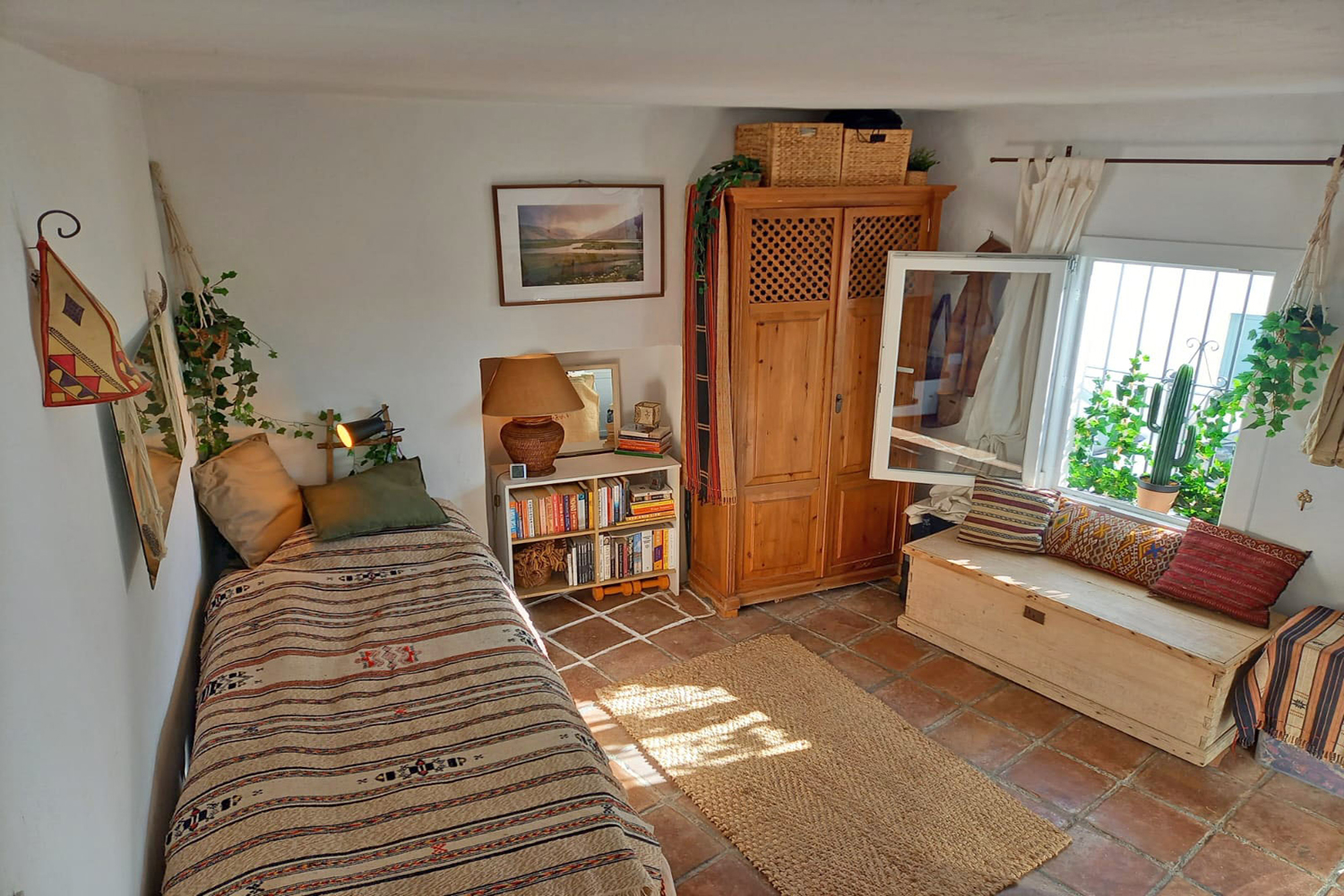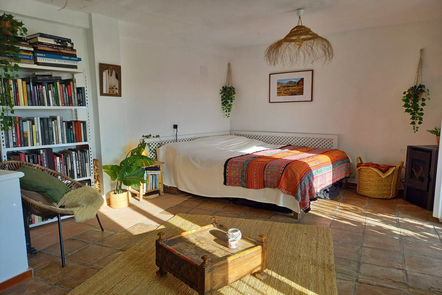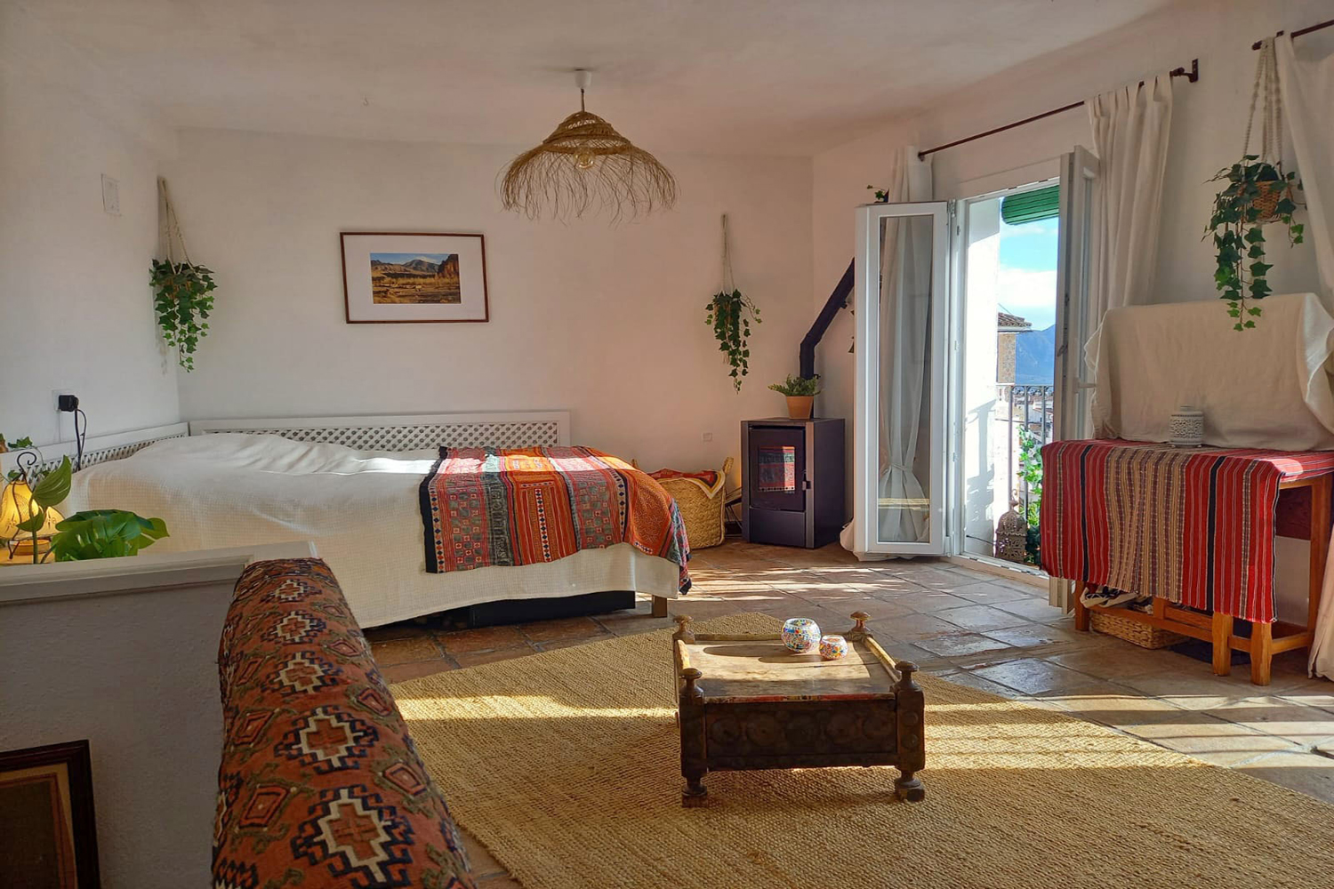 The attractive staircase with pretty Andalusian tiled risers has some built-in storage space alongside. The upper floor comprises a spacious, light & airy open plan room with nice views. This roomy dual-purpose space comprises a comfortable sitting area, plus plenty of space for a double bed. A small dining table can also be fitted in on this floor, and heat is provided by a pellet stove tucked in the corner. The two French windows each have a Juliet balcony with lovely views of the village, El Hacho mountain, and partial views to the Mediterranean coastline.