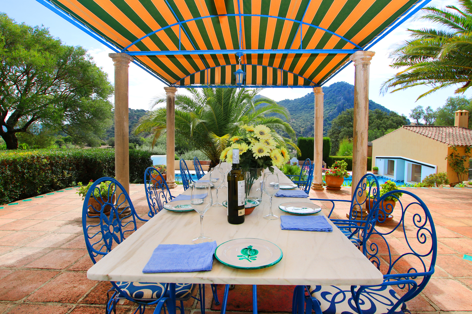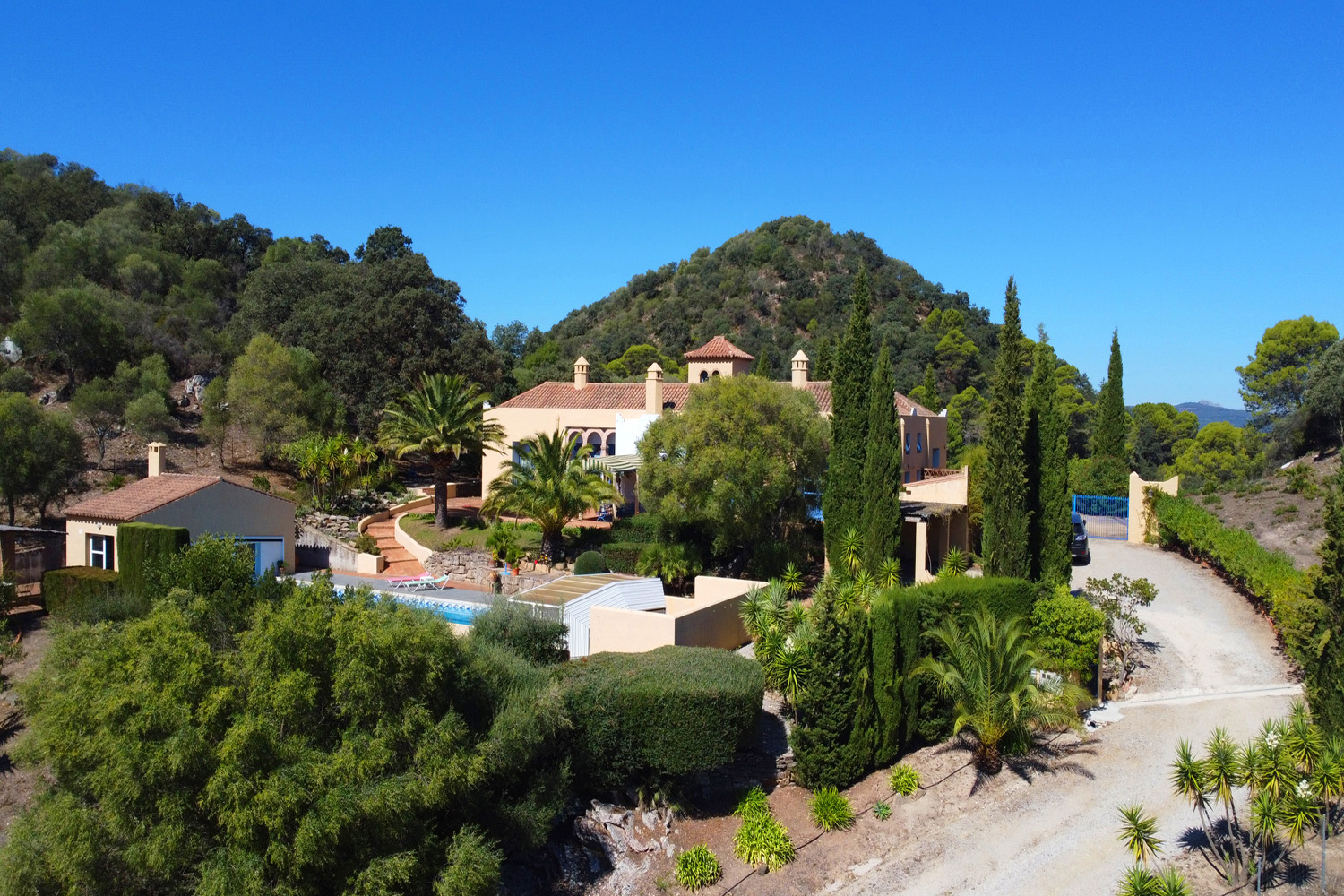 A large terrace, with covered seating area, connects the main house with the marvellous pool area just below. The extensive swimming pool (20m x 5m) is surrounded by terraces and has a fully retractable roof and can be heated during the winter months. There is a pool house adjacent with shower/changing facilities, and can be used as a gym area.