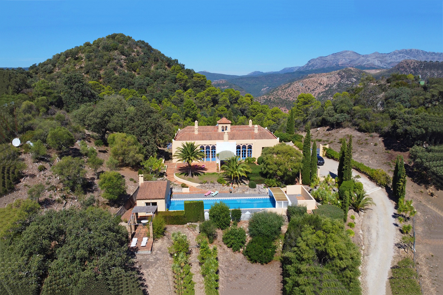 A unique and majestic Moorish style villa in an elevated location with wonderful far-reaching views across picturesque valleys towards the cork forests and distant mountains of the Serrania de Ronda and Alcornocales Natural Park. Only 15 mins from the magical ‘White Village’ of Gaucin!