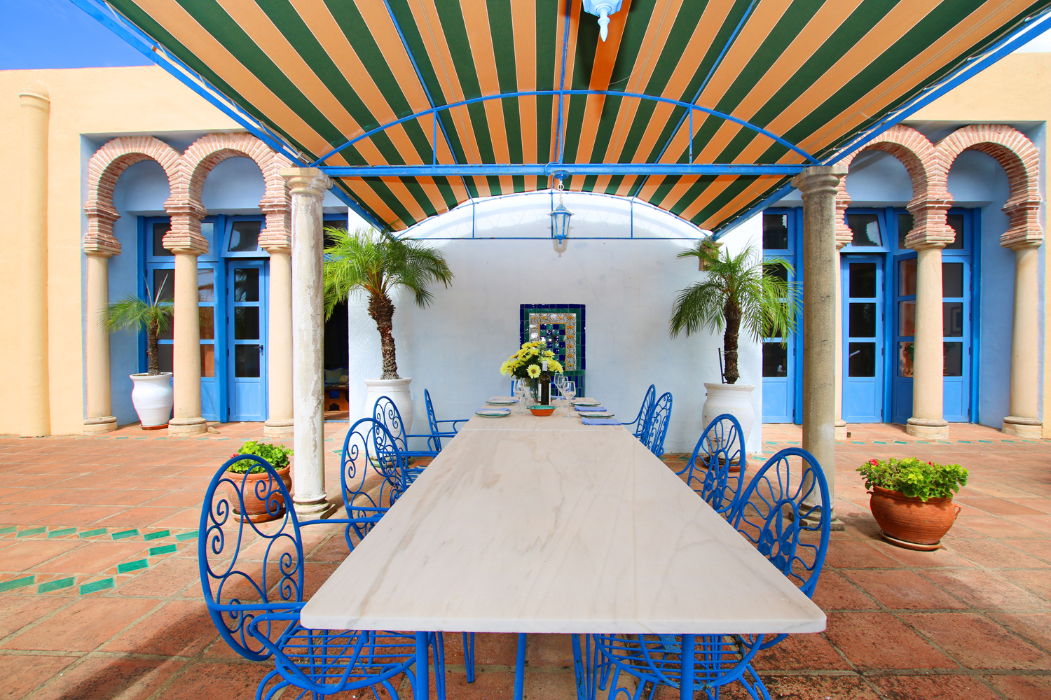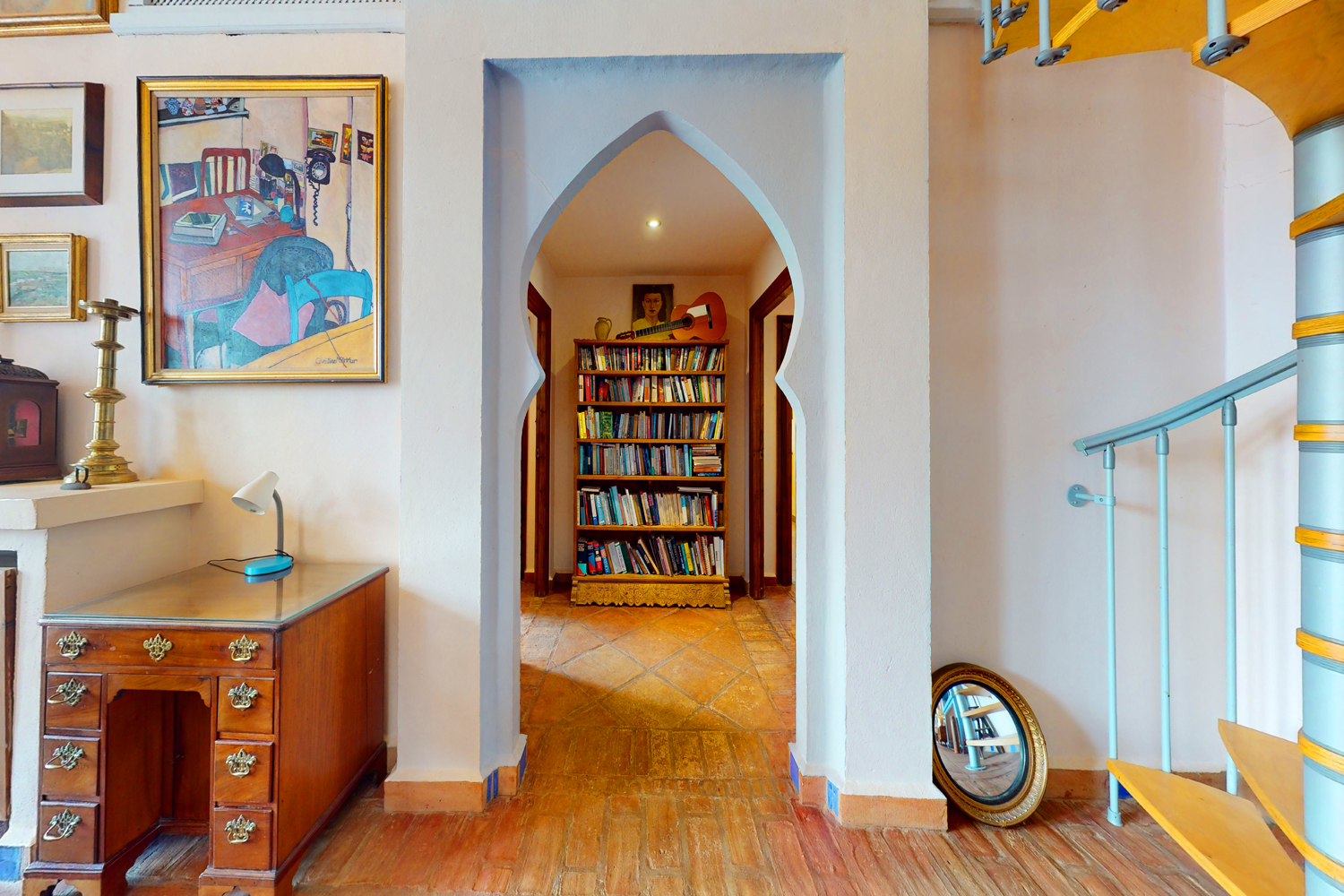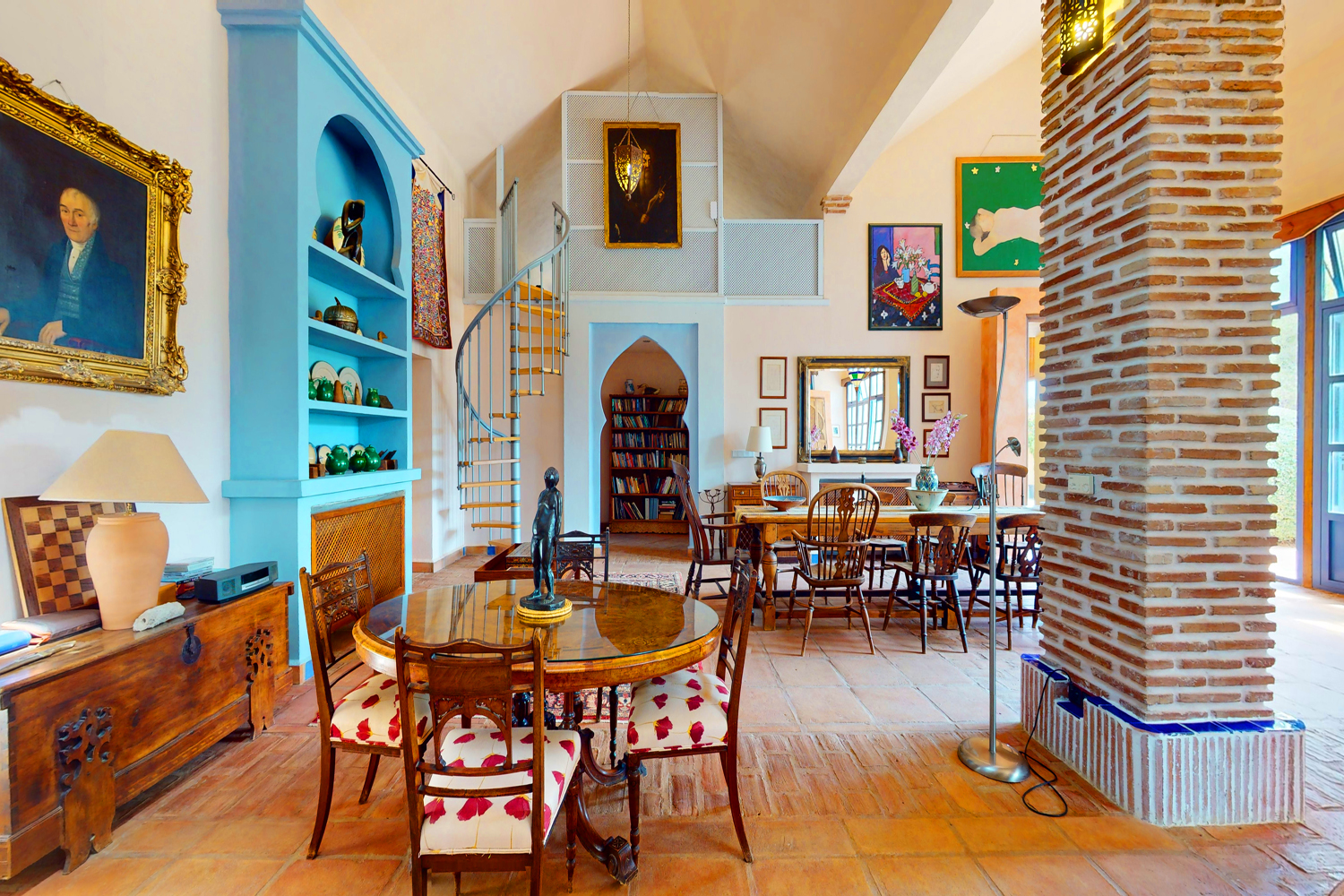 This architect-designed villa faces south and is very light, airy & spacious with double-height ceiling in the huge living room ~ the whole villa delightfully combines Andalusian charm with authentic Moorish character. The main living accommodation is all on one level, with the exception of two mezzanine areas accessed via spiral staircases from the living area. The villa is finished with an eye for detail, including arched doorways, original tiling and antique wood doors etc.
