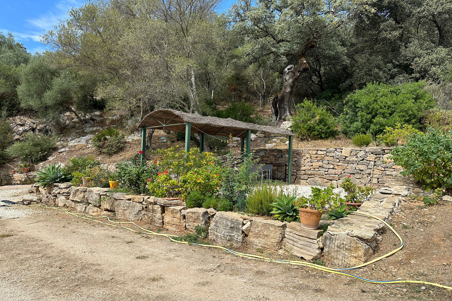 Outside the apartment there is a pretty shaded terrace, covered parking area and a wood-store. There are lovely views of the mountains & pastures, and nearby there are several oak & olive trees. A short pathway leads down to a locked storage room for farm tools, etc. and also to the barn below.