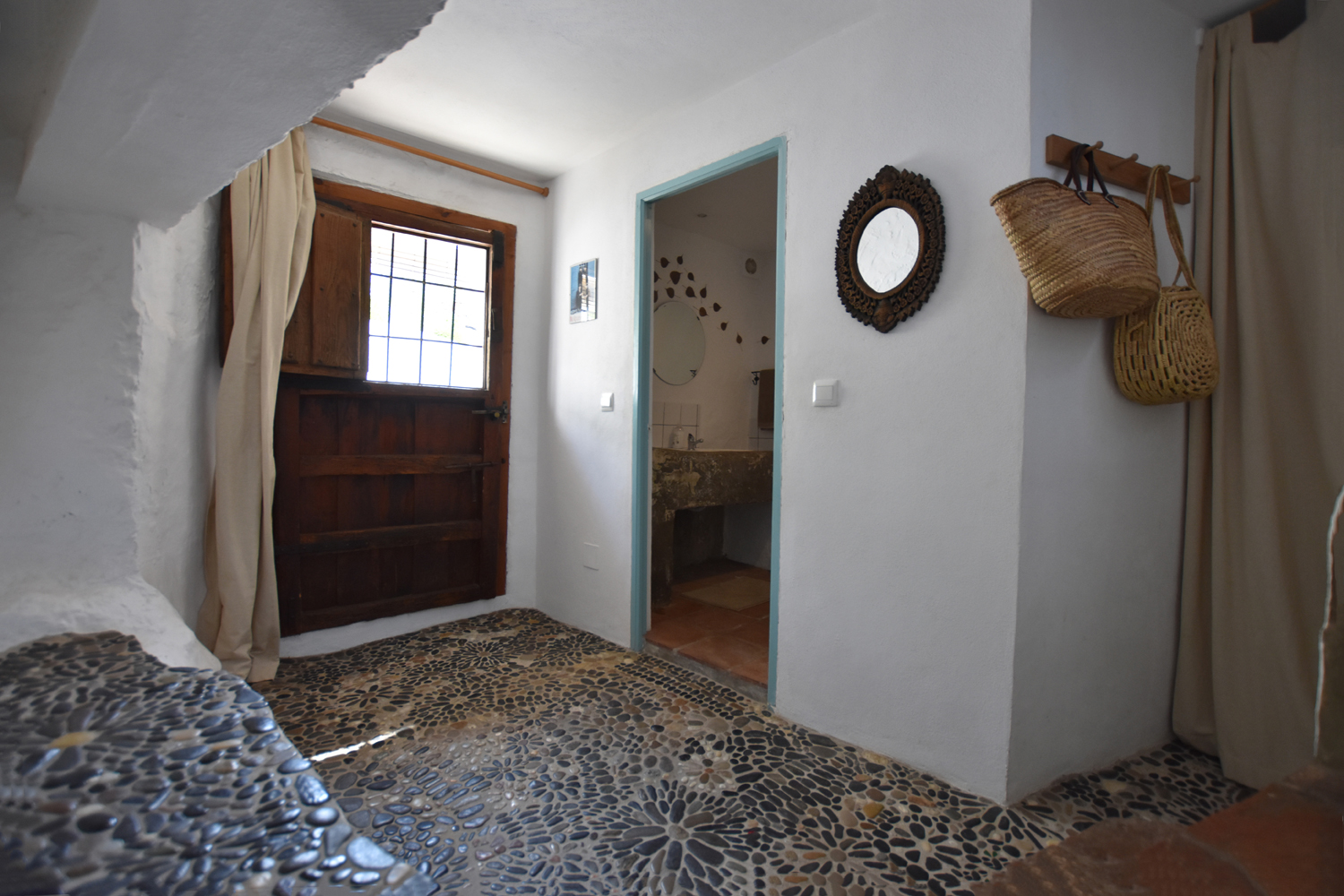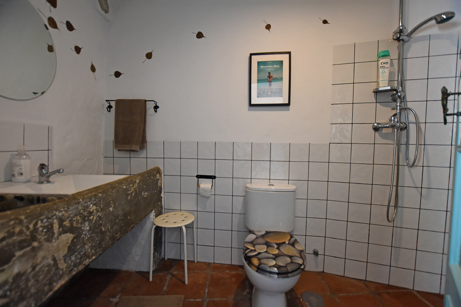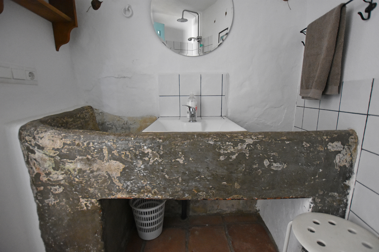 In the corner of the kitchen, a few steps lead up to the rear entrance of the house. The beautiful antique wooden door opens into an attractive ‘pebbled’ vestibule with built-in seating, and a generous guest WC/shower-room that features the original old stone sink.