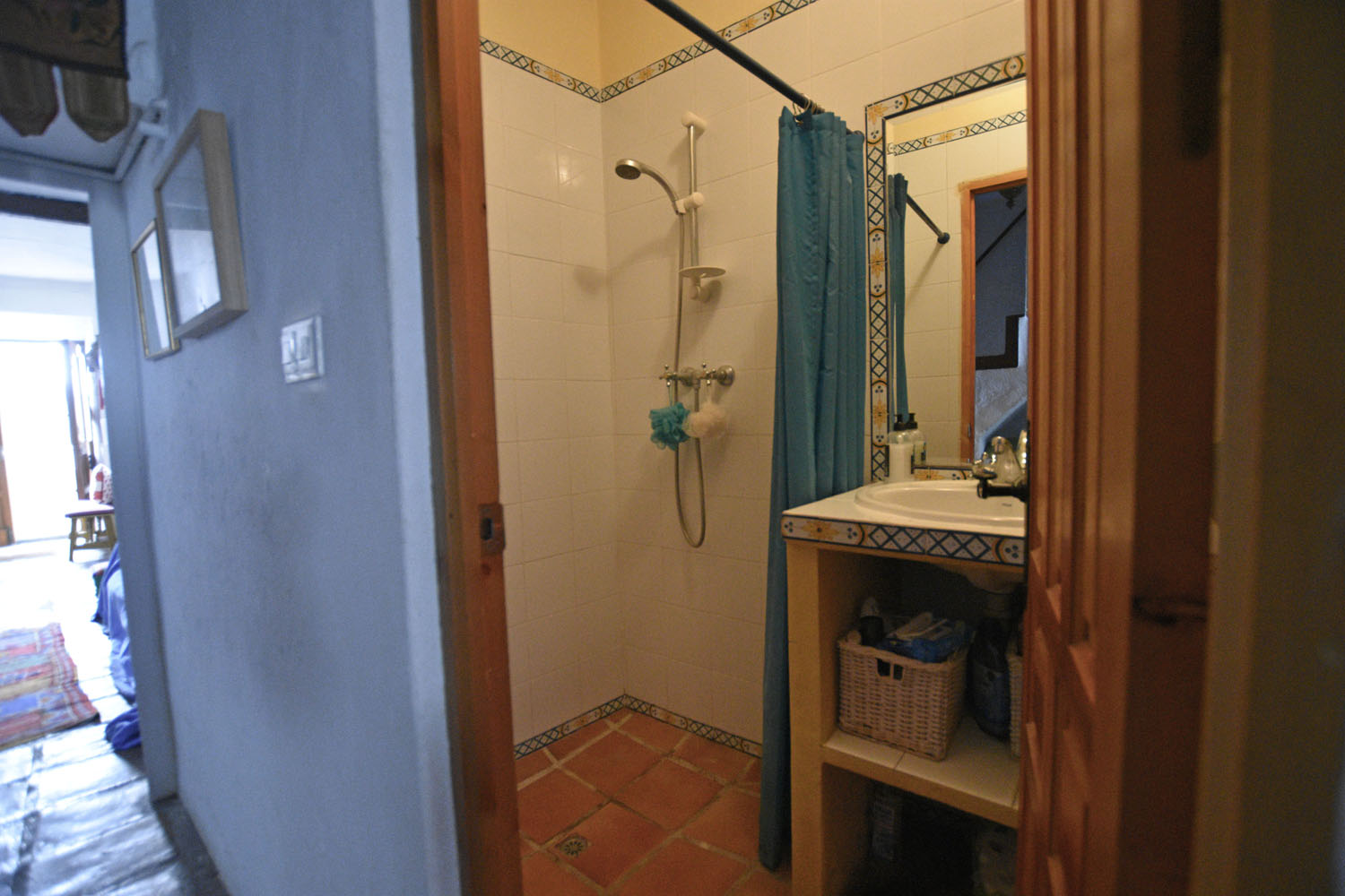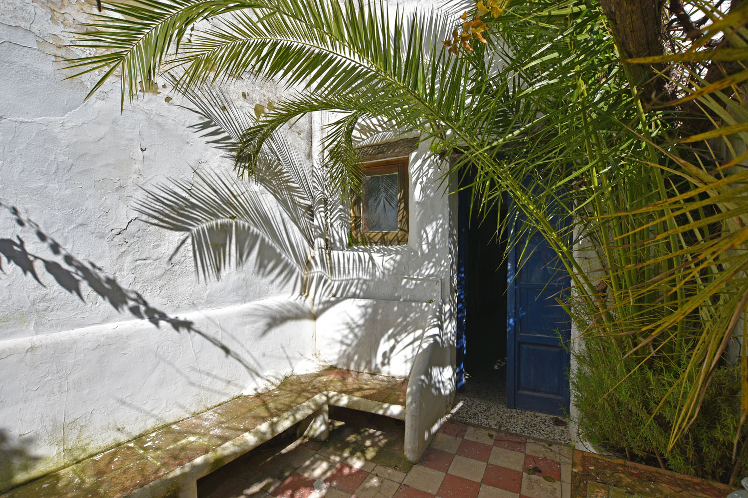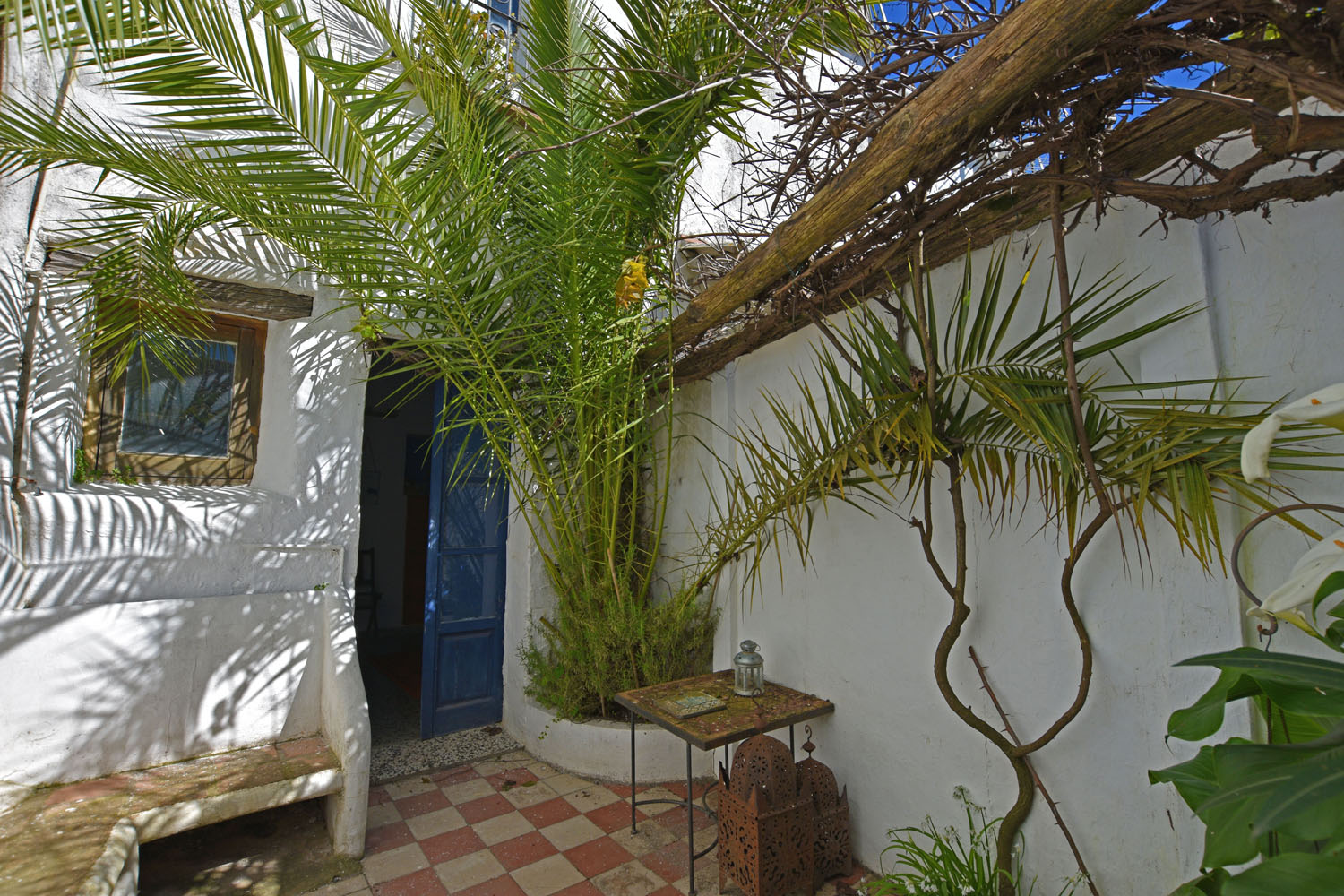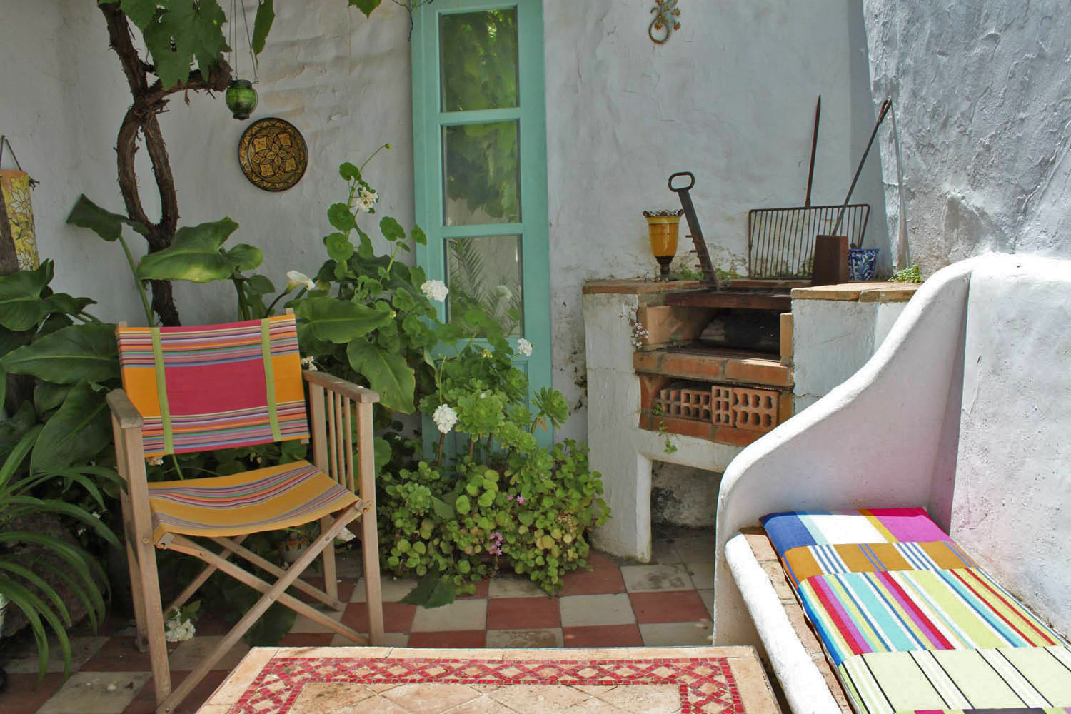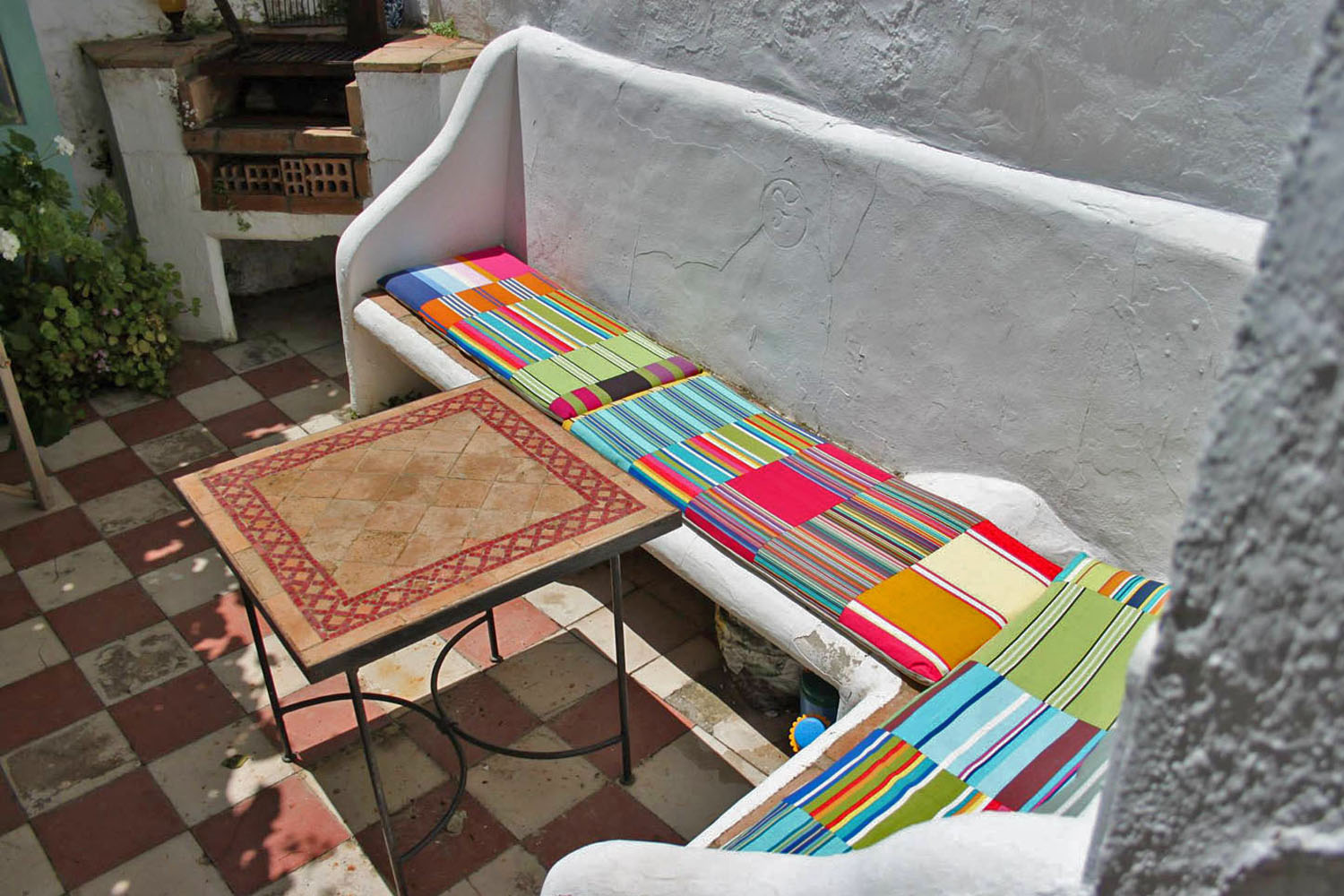 The kitchen is typically Andalusian with decorative blue & white tiling. It is quite spacious, with room for a small breakfast table. Glazed French doors open into the small patio with antique ‘hydraulic’ floor tiles, and built-in seating ~ a delightful spot for a BBQ, with a lovely palm tree providing some welcome shade in the summer months.