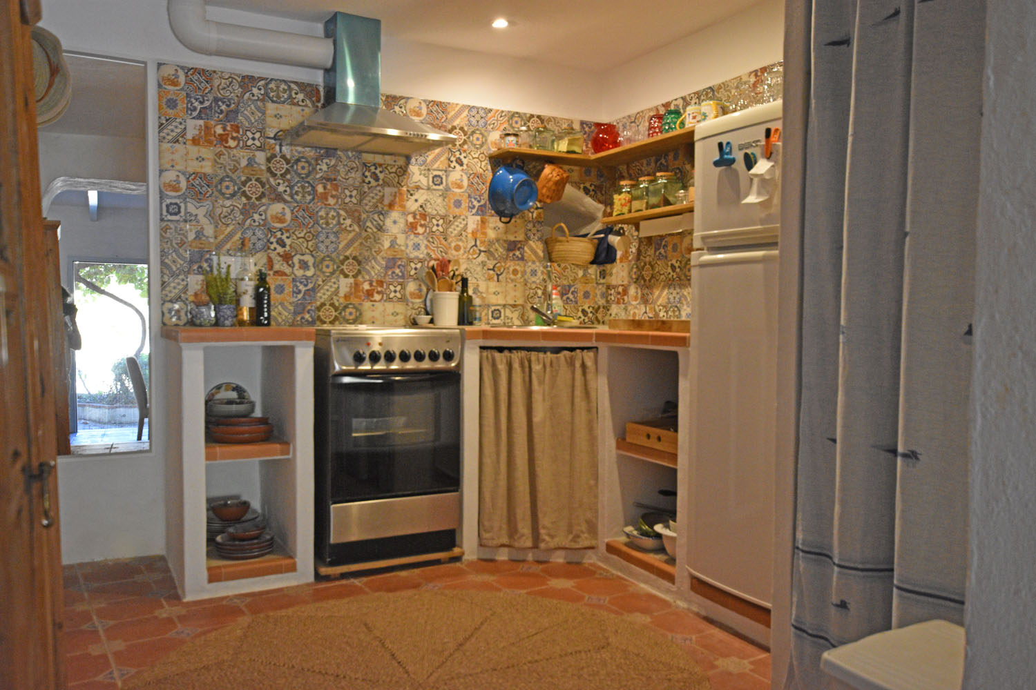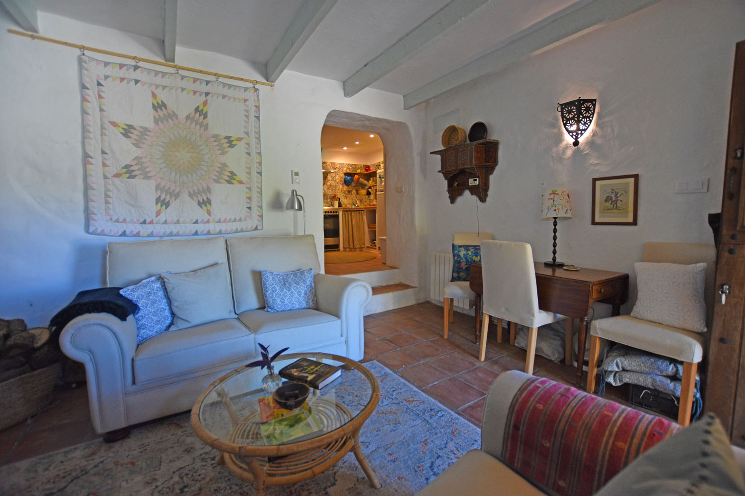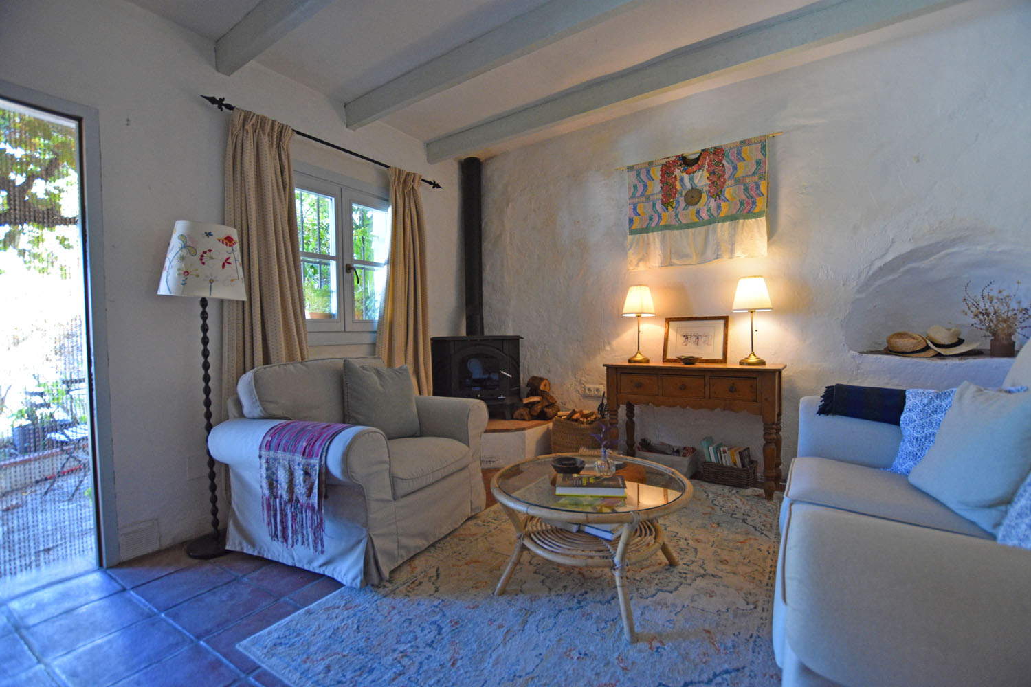 At the entrance to the cottage is a quaint little patio garden (with room for a small table), full of fragrant flowering shrubs & plants, including a Nispero tree, jasmine, oleander and a grapevine. The entrance door opens directly into the charming & comfortable open plan living space with a wood-burning stove, original terracotta tiled floor & oak-beamed ceiling. A Moorish archway leads into the pretty kitchen with colourful Andalusian wall tiles, and a useful storage area used as a pantry.