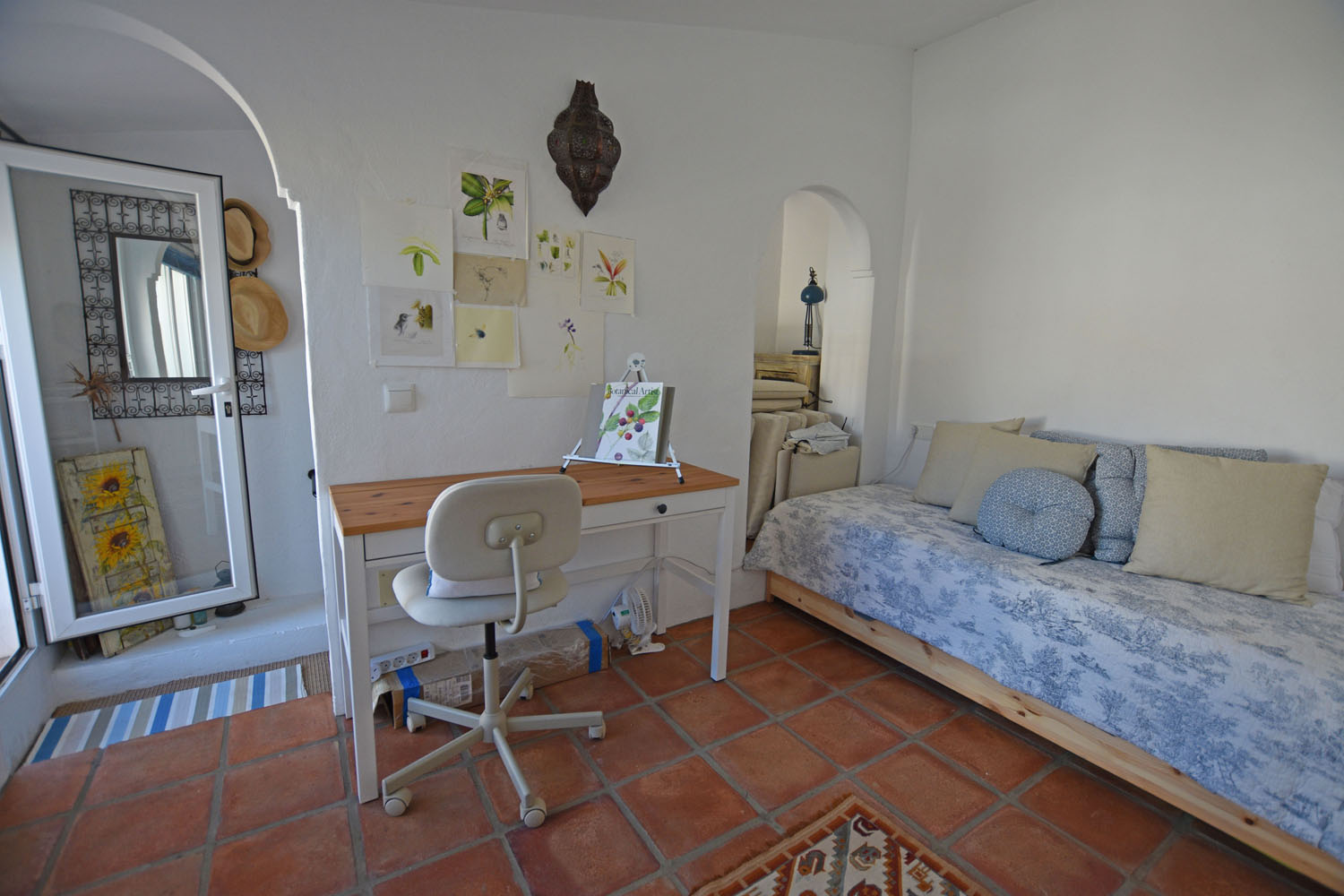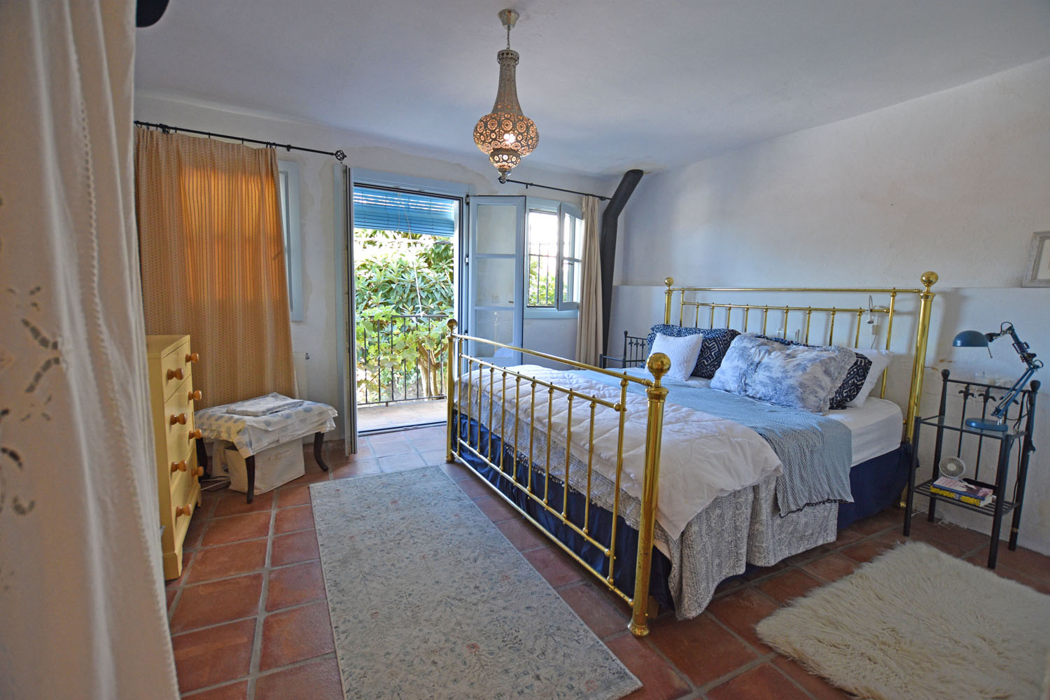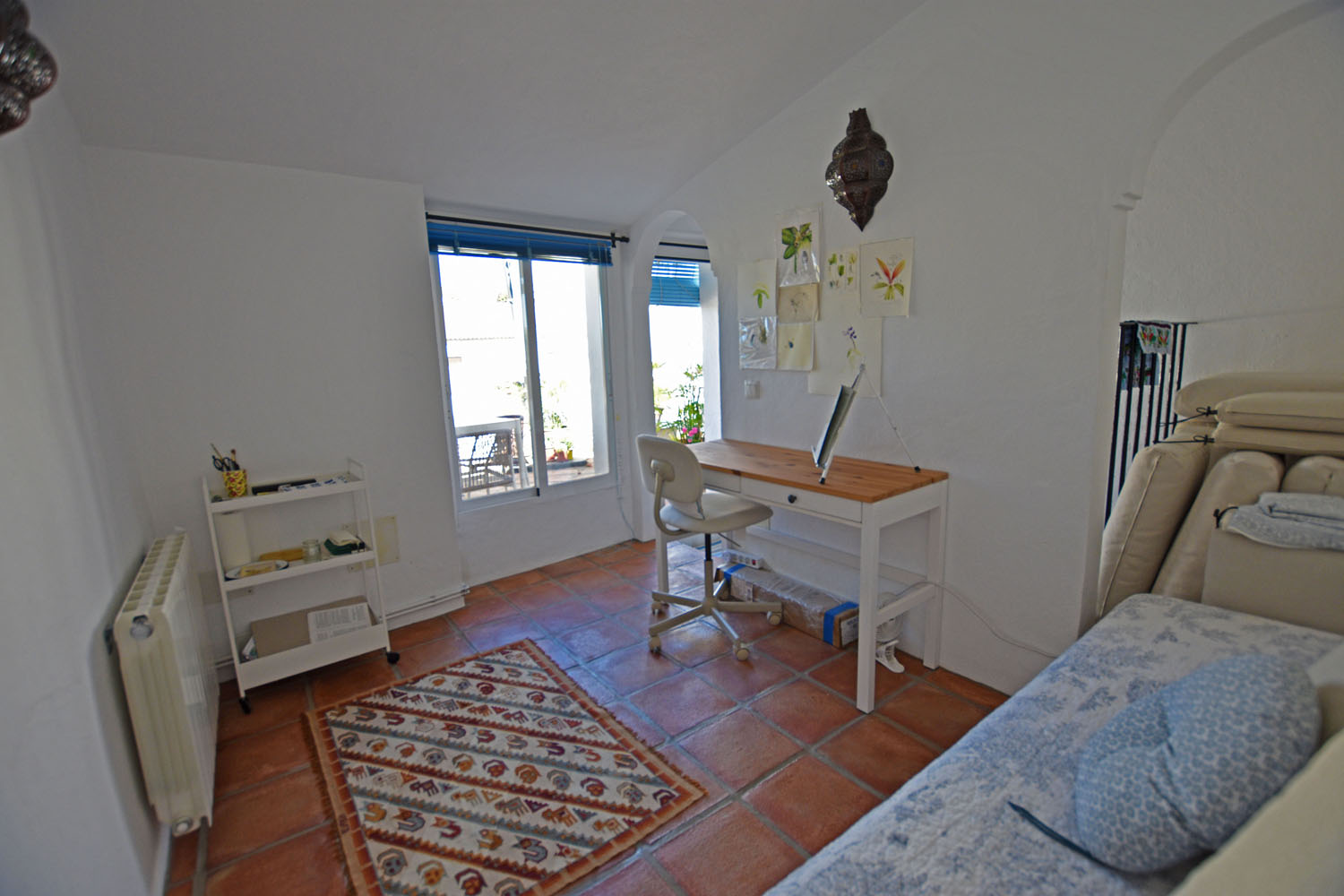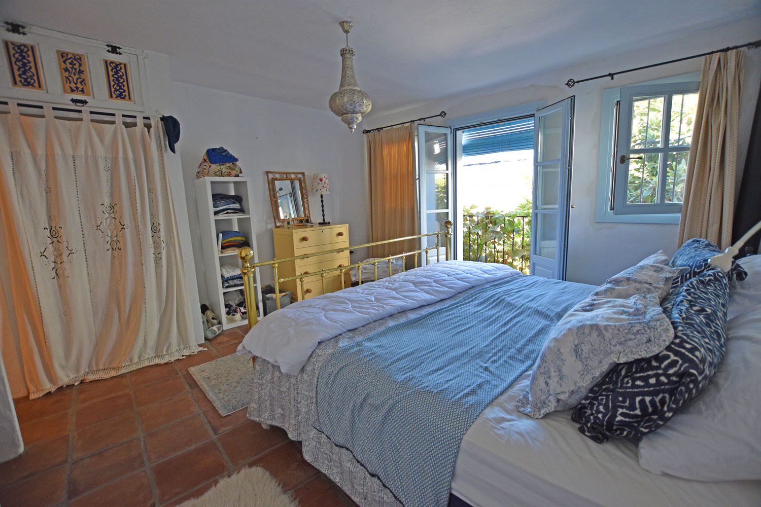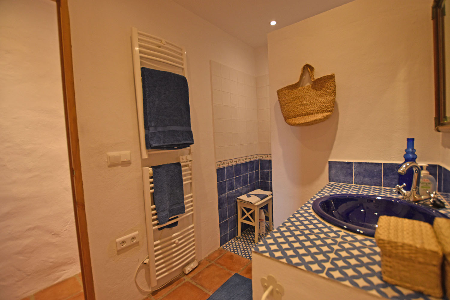 From the kitchen, an ancient stone staircase leads up to the Master bedroom, with built-in wardrobe space & terracotta floor tiles. This is a delightful, light & airy room with French doors opening to a balcony across the front of the cottage overlooking the patio. From here, there is a beautiful view of El Hacho mountain to the west (and the wonderful sunsets!). The adjacent shower room is well presented, bright & cheery with pretty Andalusian blue tiling and a walk-in shower.
