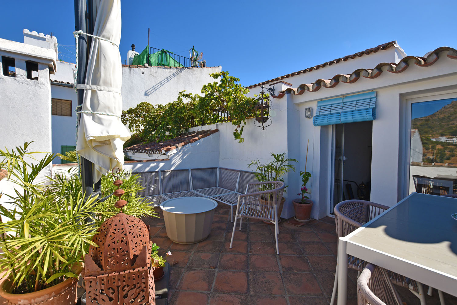 From the adjacent spacious & sunny terrace, there are far-reaching views of the countryside to the south west and, closer to home, there is a wonderful view of ‘El Hacho’ mountain, backdrop to some gorgeous sunsets. This terrace offers a delightful spot for alfresco dining and relaxing, and there is also a free-standing shower for cooling off!
