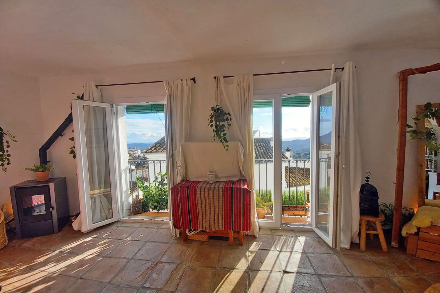The attractive staircase with pretty Andalusian tiled risers has some built-in storage space alongside. The upper floor comprises a spacious, light & airy open plan room with nice views. This roomy dual-purpose space comprises a comfortable sitting area, plus plenty of space for a double bed. A small dining table can also be fitted in on this floor, and heat is provided by a pellet stove tucked in the corner. The two French windows each have a Juliet balcony with lovely views of the village, El Hacho mountain, and partial views to the Mediterranean coastline.