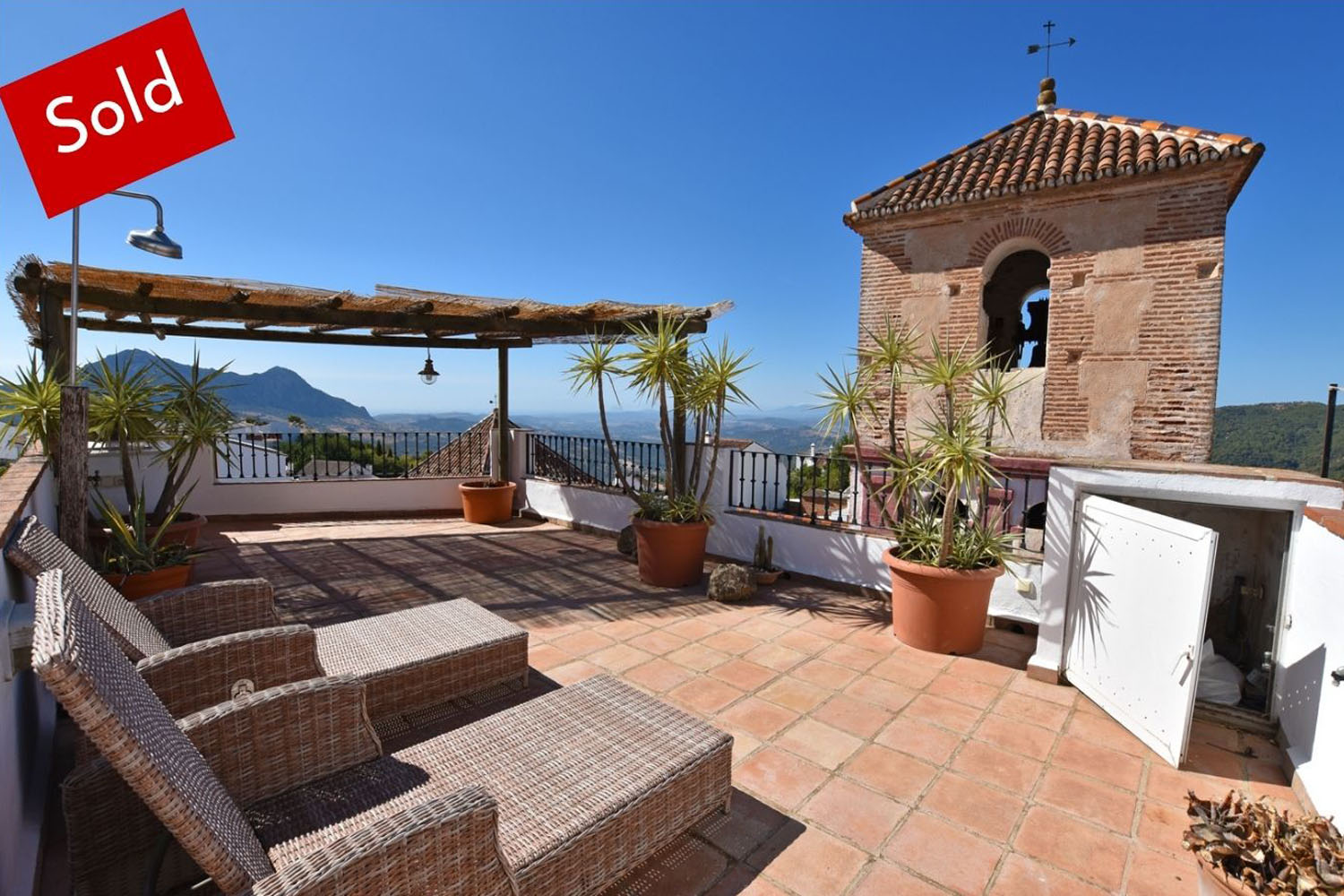 Esta imponente casa de pueblo, en una ubicación privilegiada, ofrece vistas panorámicas y una fabulosa terraza en la azotea con increíbles vistas de 360°. Sobre los tejados de tejas rojas, se divisa el Castillo de las Águilas, a menudo iluminado por la noche. Hacia el sur, la magnífica vista se extiende por el valle del río Genal hasta el Mediterráneo, Gibraltar, la costa del norte de África y las montañas del Rif.